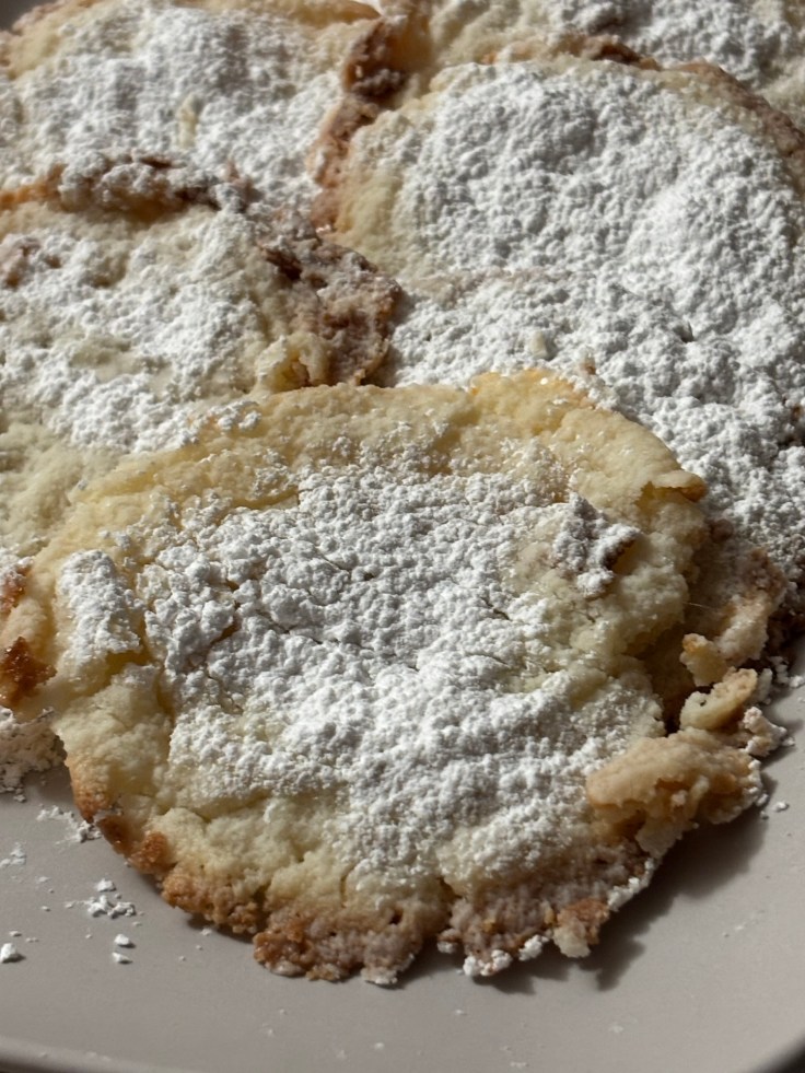 I originally found this recipe listed as Wedding Cookies, but the results were not what I normally associate as such. These cookies more closely resemble a lacey Almond Thin. I feel like the original recipe author perhaps forgot an ingredient when posting (an egg, maybe?), but the results were these rich, thin cookies that became my favorite contribution to the Christmas cookie season.