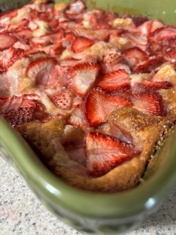 • Bake for 55 to 60 minutes or until the batter is golden brown and the strawberry juices are bubbling. In the last 15 minutes or so, sprinkle with turbinado sugar for texture, if desired.